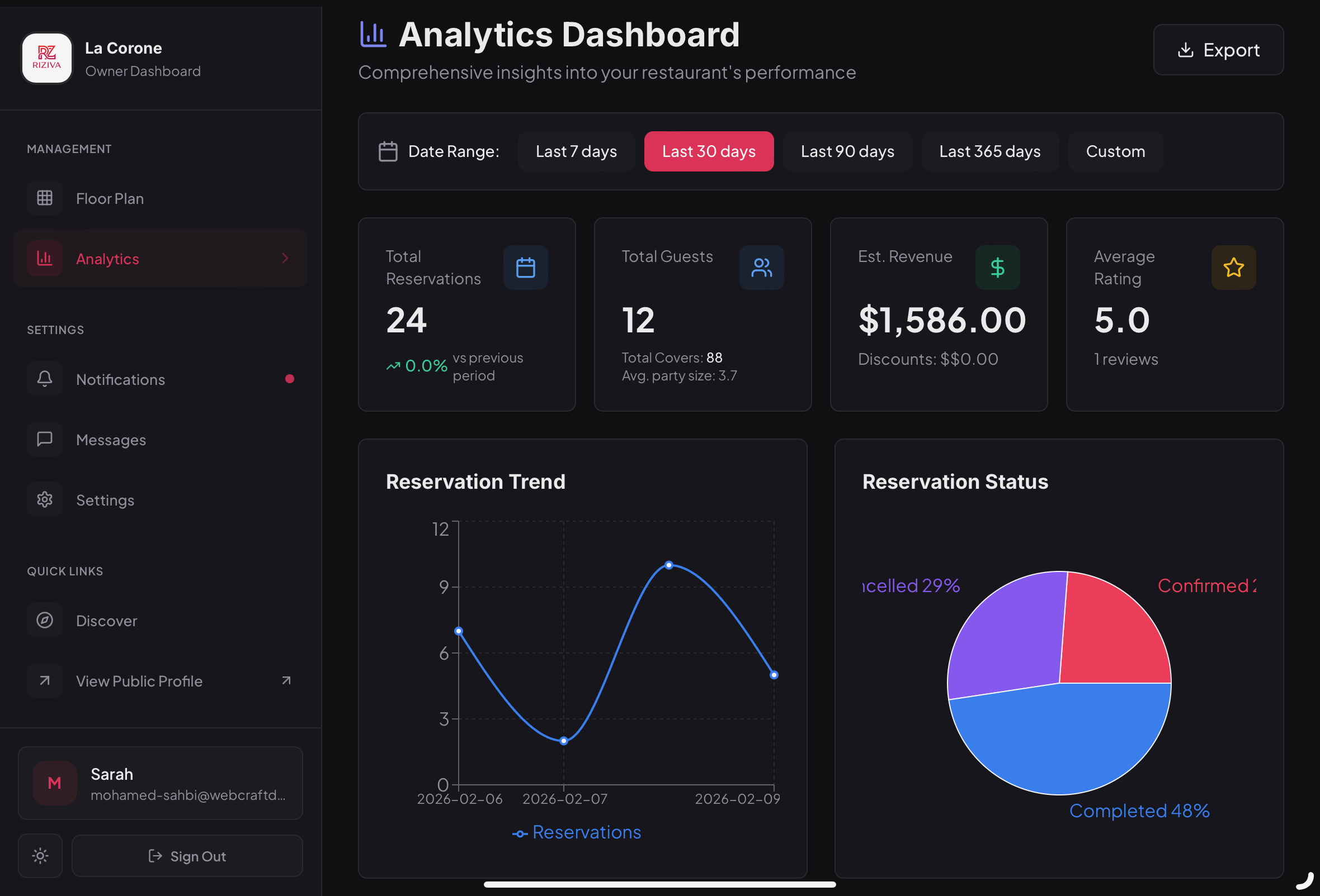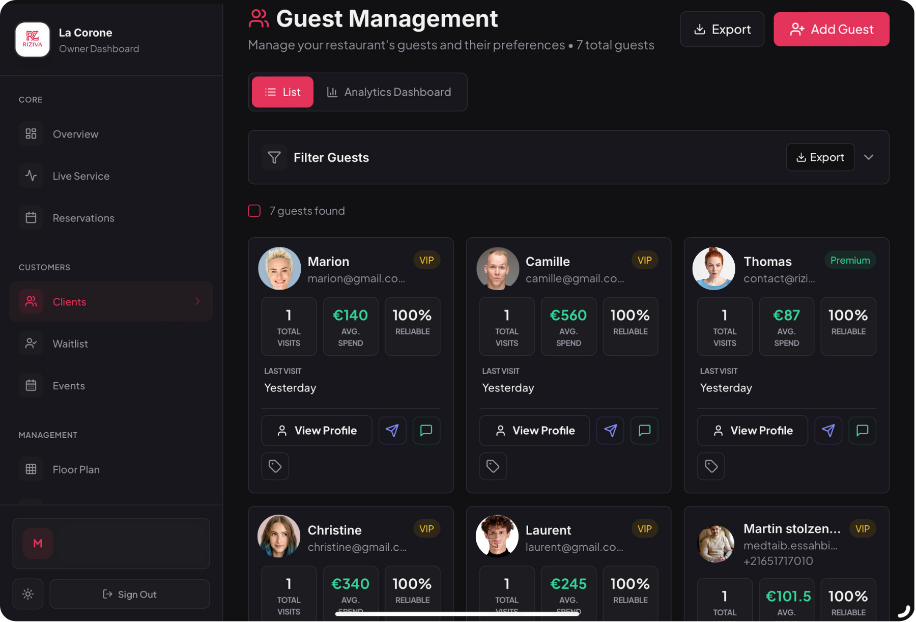 Riziva Dashboard - OverviewRiziva Dashboard - Floor PlanRiziva Dashboard - ReservationsRiziva Dashboard - AnalyticsRiziva Dashboard - Guest Management